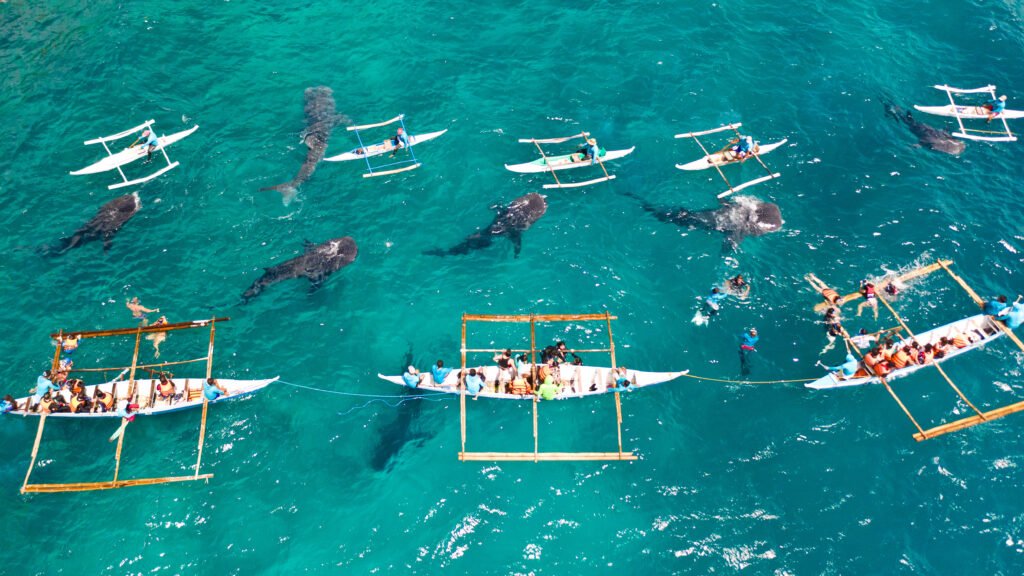 • Whale sharks glide beneath the surface, observed from traditional outrigger boats (Bancas) that drift silently above clear waters. Trained guides ensure respectful, eco-conscious encounters as the majestic creatures feed on plankton and krill, offering a rare glimpse into one of the ocean’s largest fish species.