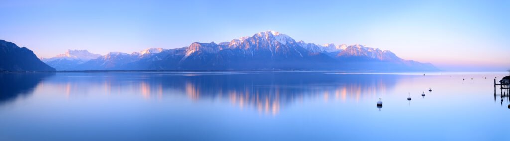 Lake Geneva shimmers at dusk, its waters holding the reflection of mountains and dreams.