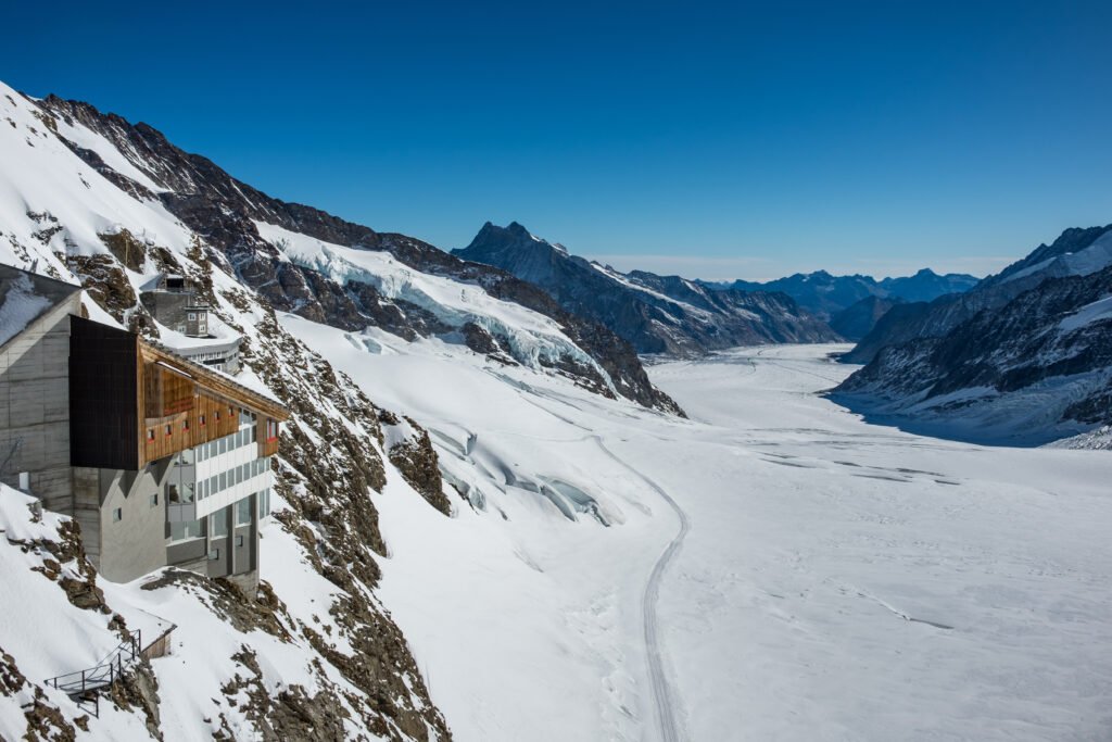 The ascent to Jungfraujoch unfolds like a hymn, glaciers gleaming beneath the wide, eternal sky.